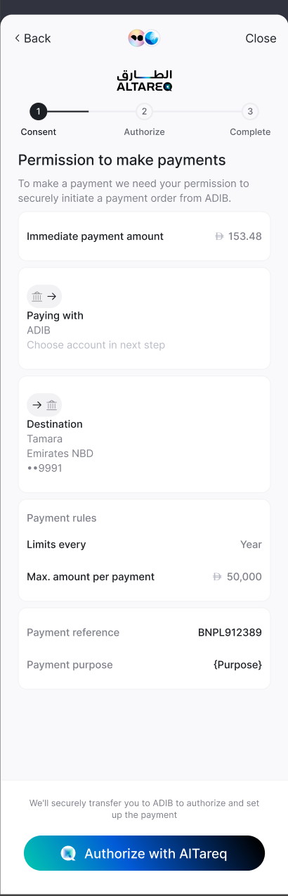 Due to Open Finance regulations, customer-facing screens in payment flow, must be certified by Nebras and offer limited customisation.